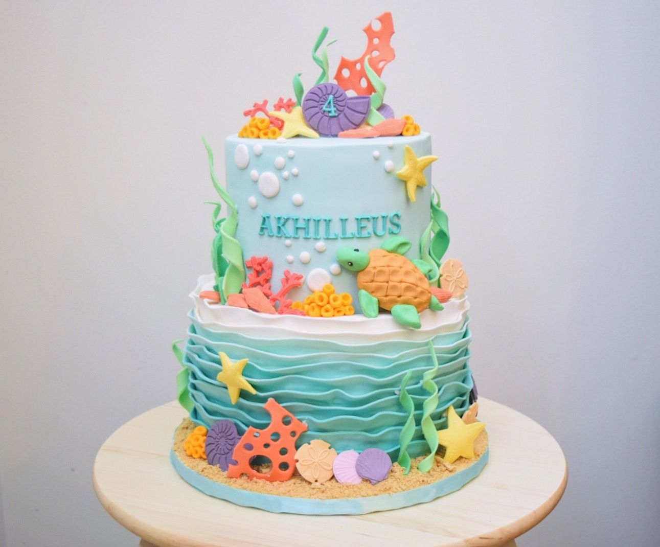 This pink-purple-green-blue-hued cake, complete with all of the gorgeous aquatic creatures such as coral, seahorses, seashells, and fish, will make all of the children scream with delight and excitement. The celebration theme will be smashed by this cake.