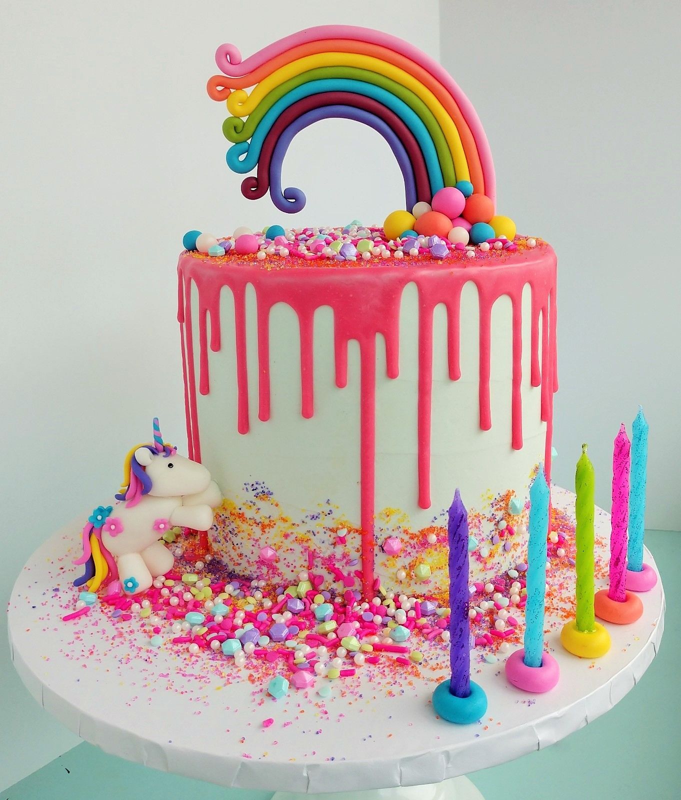 A rainbow-themed birthday cake is appropriate for a true rainbow enthusiast! This multicoloured layer cake is adorned with rainbow buttercream icing roses. Your little princess will be enthralled to see this beautiful rainbow cake.