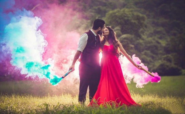 You can use smoke bombs to add various coloured smoke to your photo and create magic with them. These photos look very timeless and colourful, and you can frame them for a lifetime.
