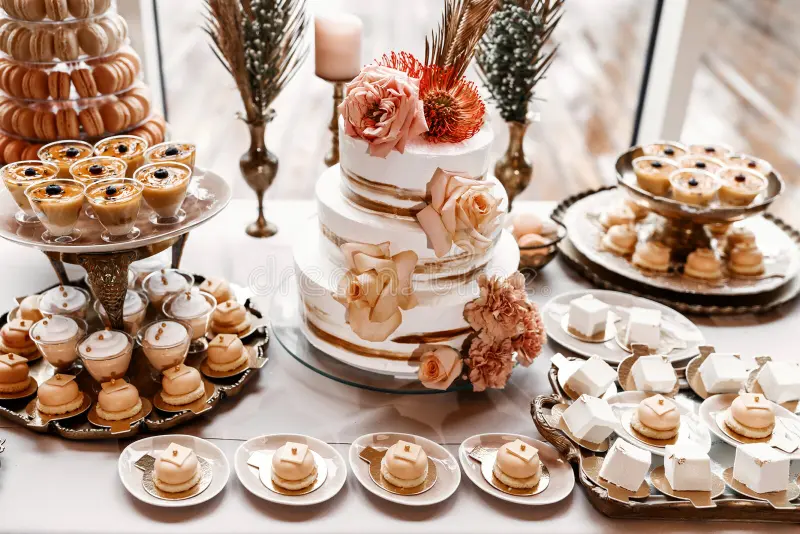 Desserts are the grand finale of the wedding meal and should never be an afterthought. Create a diverse dessert section that includes: