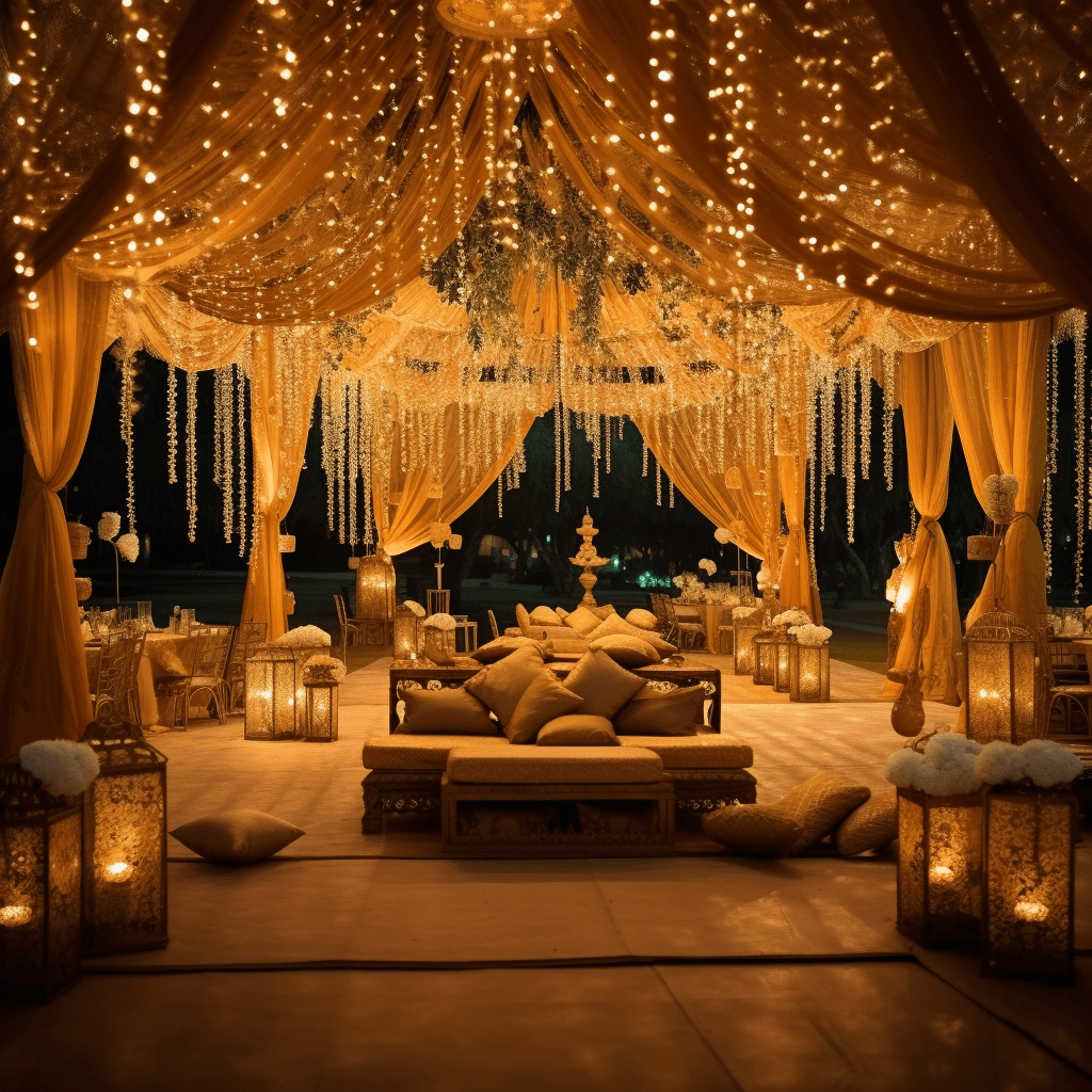 Use traditional elements like marigold garlands, rangoli patterns, and lanterns.