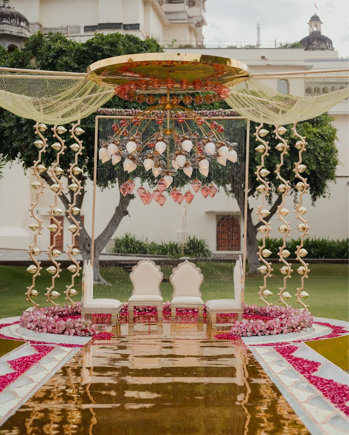 Floating Lotus Canopy: Imagine a mandap draped in pastel pink and ivory fabrics, with lotus blooms hanging from crystal strings. Add soft lighting for a divine glow.