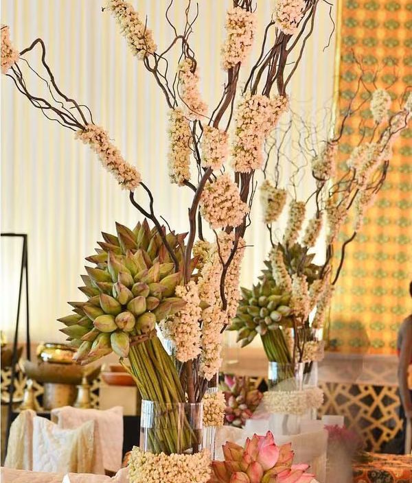 Centrepieces can make or break your table setup. Lotus and mogra can easily fit both minimalist and royal wedding themes.