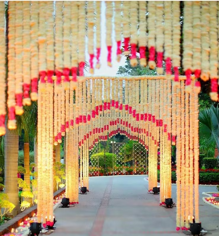 Absolutely! Lotus and Mogra décor works well in both settings. For indoor weddings, you can use floral chandeliers, garland curtains, and centrepieces. For outdoor weddings, floating lotus ponds, mogra archways, and mandap décor with fresh blooms look stunning and fill the space with a pleasant aroma.
