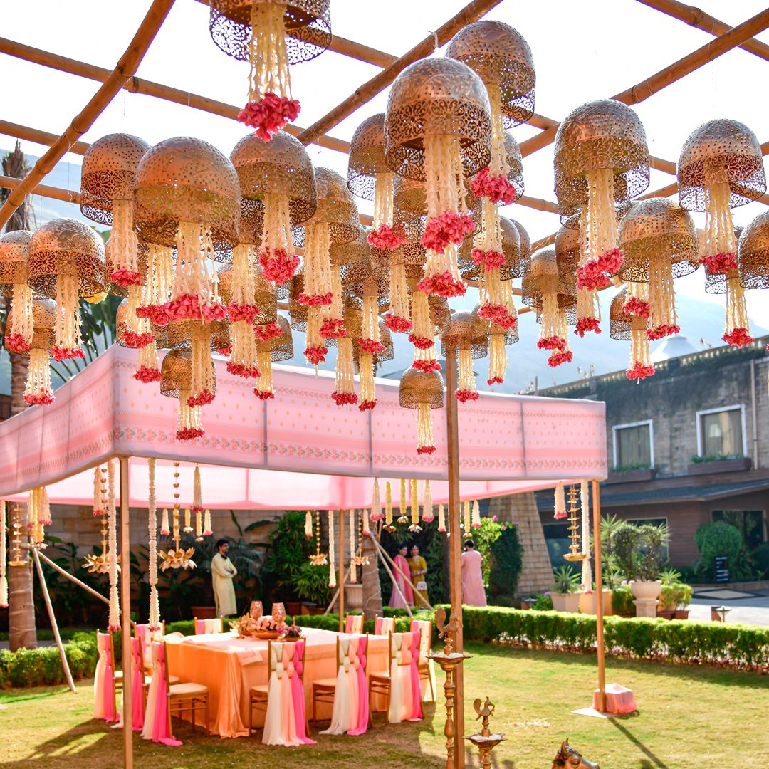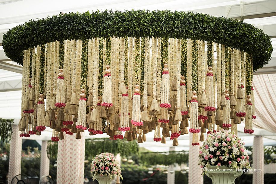 Suspended floral installations are trending in luxury weddings, and nothing beats the charm of lotus and mogra when it comes to ceiling décor.