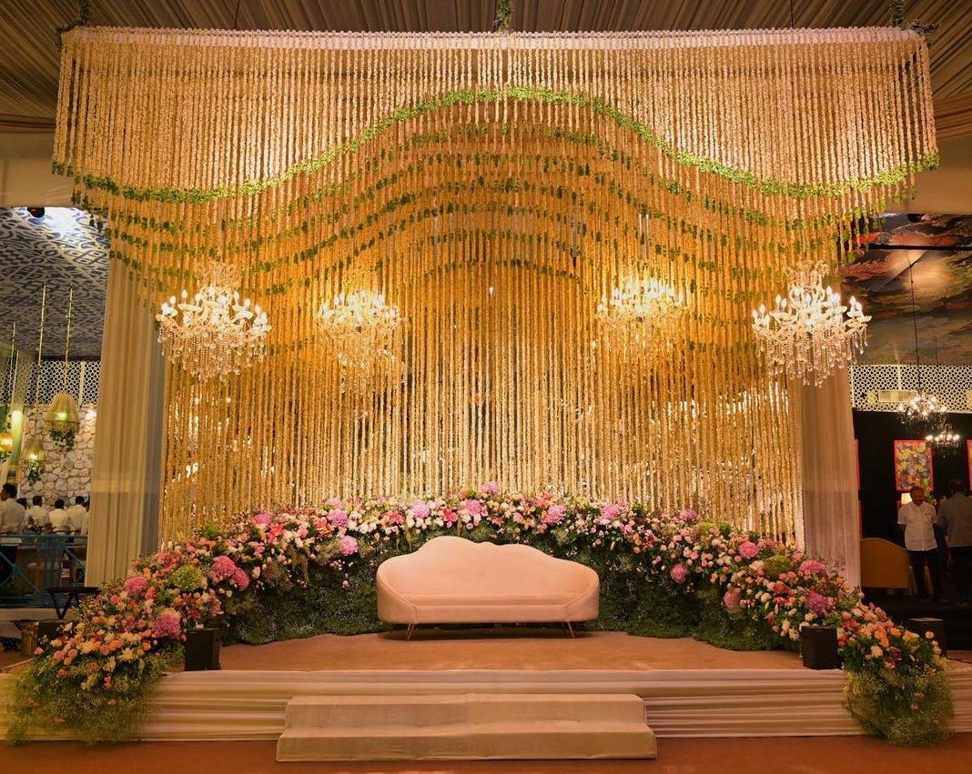 Mogra Curtain Ceiling: A cascade of mogra garlands hanging from the ceiling creates an immersive floral canopy.