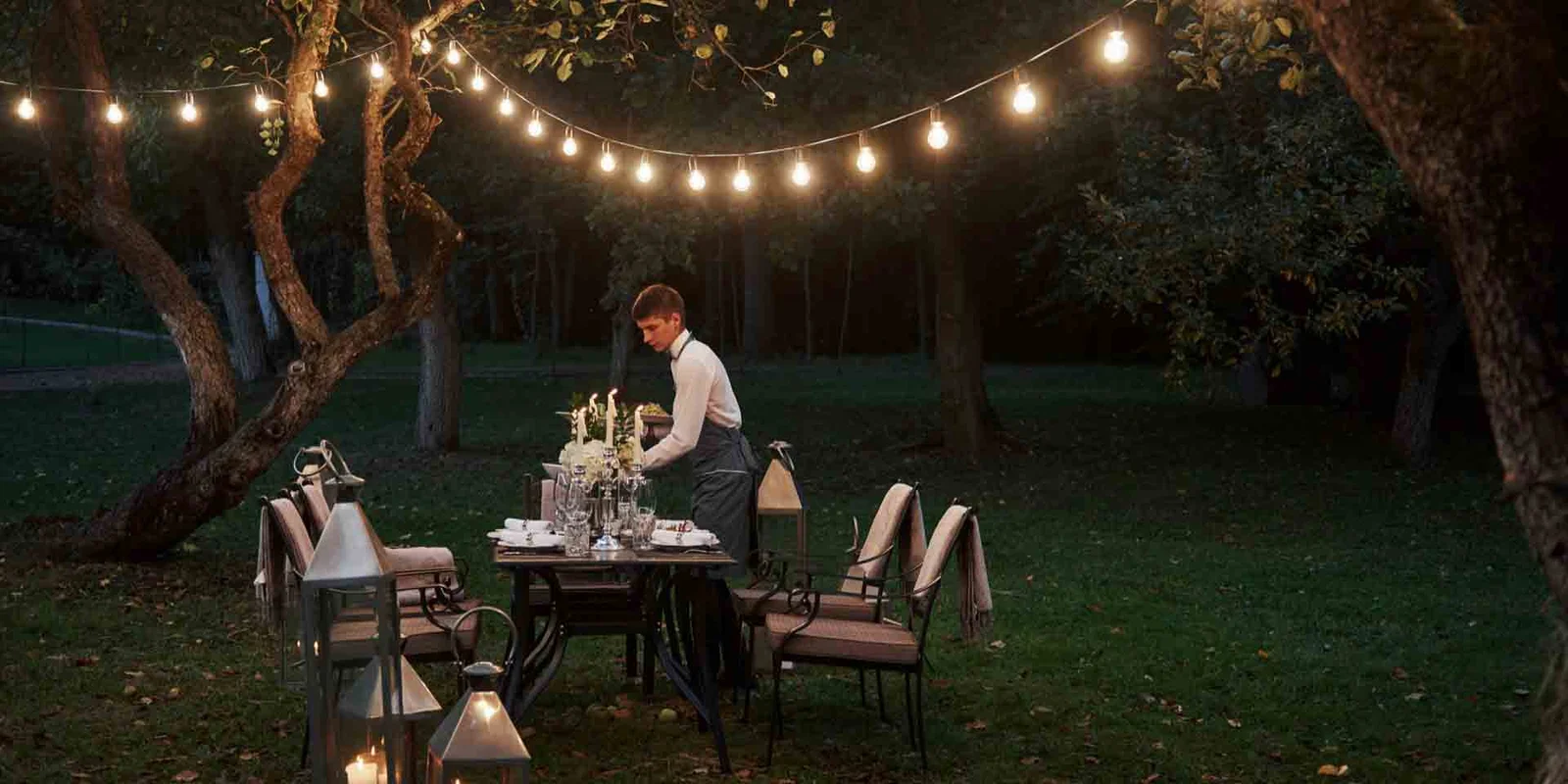 Host a premium outdoor movie night with plush seating, high-end projector, fairy lights, and warm comfort food. It’s cozy, aesthetic, and beautifully intimate.