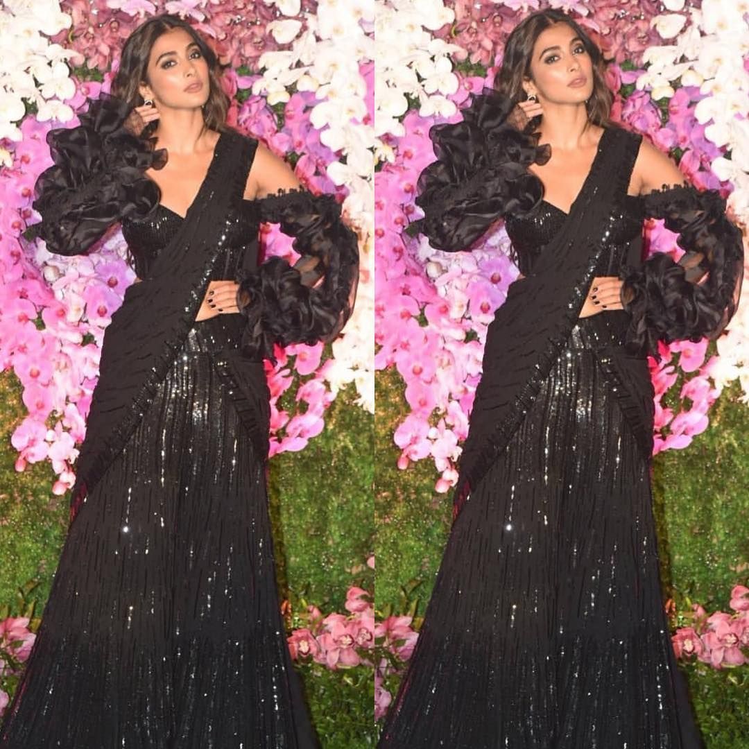 Pooja Hegde got us floored, all dolled up in a shimmery black lehenga paired with a black blouse with ruffled sleeves. She wore the outfit for Akash Ambani and Shloka Mehta's wedding reception in Mumbai. Paired with diamond earrings, this is a perfect outfit to be worn on a cocktail evening or your best friend’s sangeet ceremony.