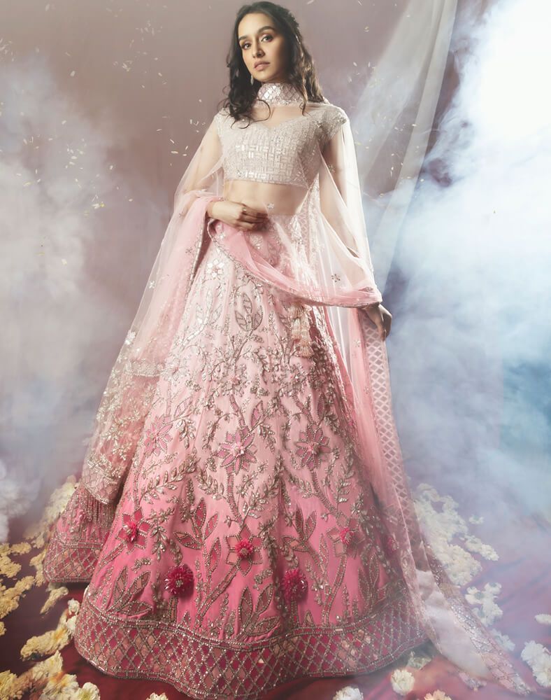 Source: PinterestWho knows how to play with colours better than the maestro himself? Manish Malhotra combines two beautiful shades of pink to create an ombré effect for this beautiful lehenga worn by Shraddha Kapoor. Floral embroidery and a sheer dupatta perfectly complement this lehenga choli. Pair it with minimalistic silver jewellery and make quite a statement at your cousin's wedding ceremony or wedding reception.