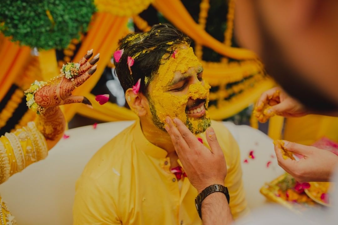 In this fun-filled ritual, turmeric paste is applied to the bride and groom’s body to enhance their glow before the wedding. This ceremony is performed at their respective homes, and family members take turns applying the haldi.