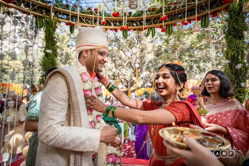 The priest chants the Mangalashtak, a set of holy wedding vows. The silk cloth is removed, and the couple exchanges garlands, signifying the beginning of their marital journey.