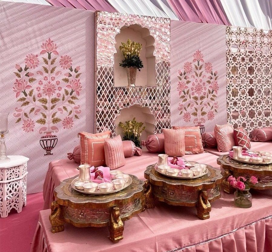This setup is especially useful for home Mehendi functions where space needs to be optimised smartly.