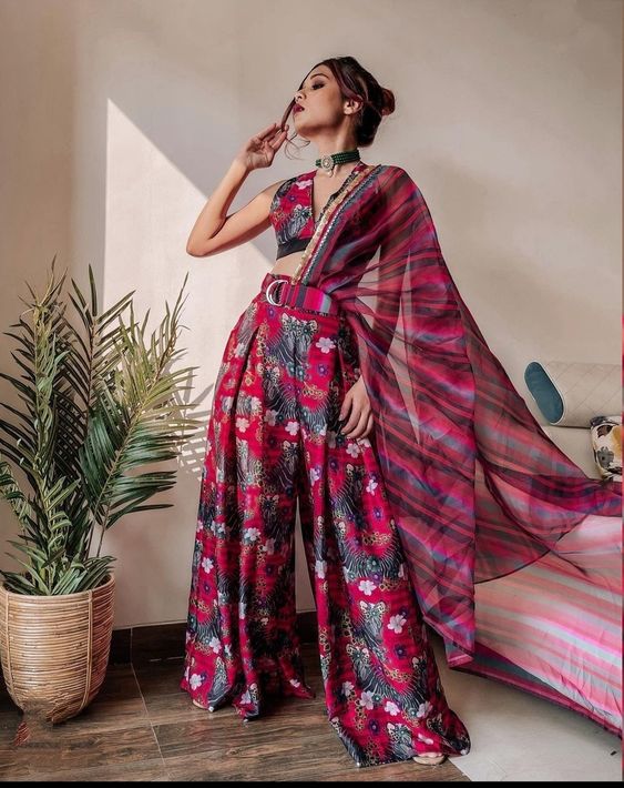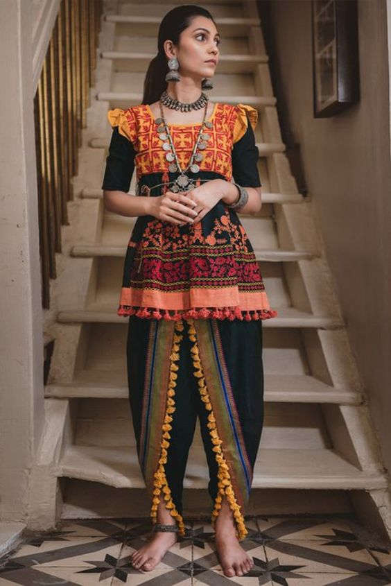 Dhoti pants have made a significant comeback and make a great choice for a unique Garba look. Pair them with a vibrant crop top or blouse, add a statement belt to accentuate the waist, and you're ready with a fusion look that's both comfortable and stylish.