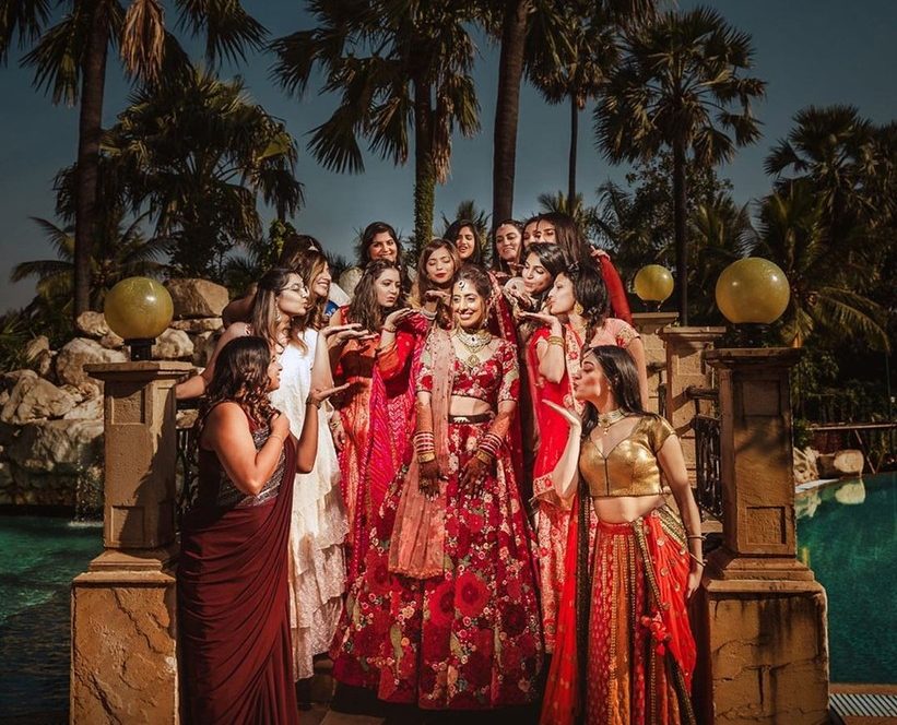 This Photoshoot style is such that it can incorporate the bridesmaids of all age groups. Strike a pretty, flying kiss pose towards the bride. Make sure that its flying kiss only, else you’d end up smearing the bride’s face with colourful pecks all over!