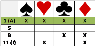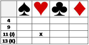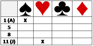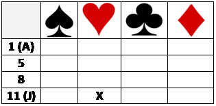 The Caller will shuffle the cards and pick up the top card from the deck facing down. Say, the card is called out as: JNow every person who has a cell with J (11) and