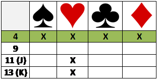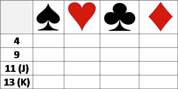 The most common deck of 52 playing cards in use today includes 13 ranks of each of the four French suits, clubs (♣), diamonds (♦), hearts (♥) and spades (♠).Now refer the sample Tambola Card Ticket above. While the top row shows the 4 suites of playing cards, the first column can have any 4 unique numbers in the range 1-13 (index of playing cards).