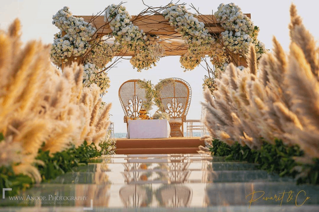 Boho weddings are gaining popularity, and pampas grass plays a starring role in the new mandap trends. Boho mandaps use neutral tones, dried flowers, macrame hangings, and earthy textures to create a soft, artistic aesthetic. They’re perfect for couples who want a laid-back, stylish, and Instagrammable vibe.