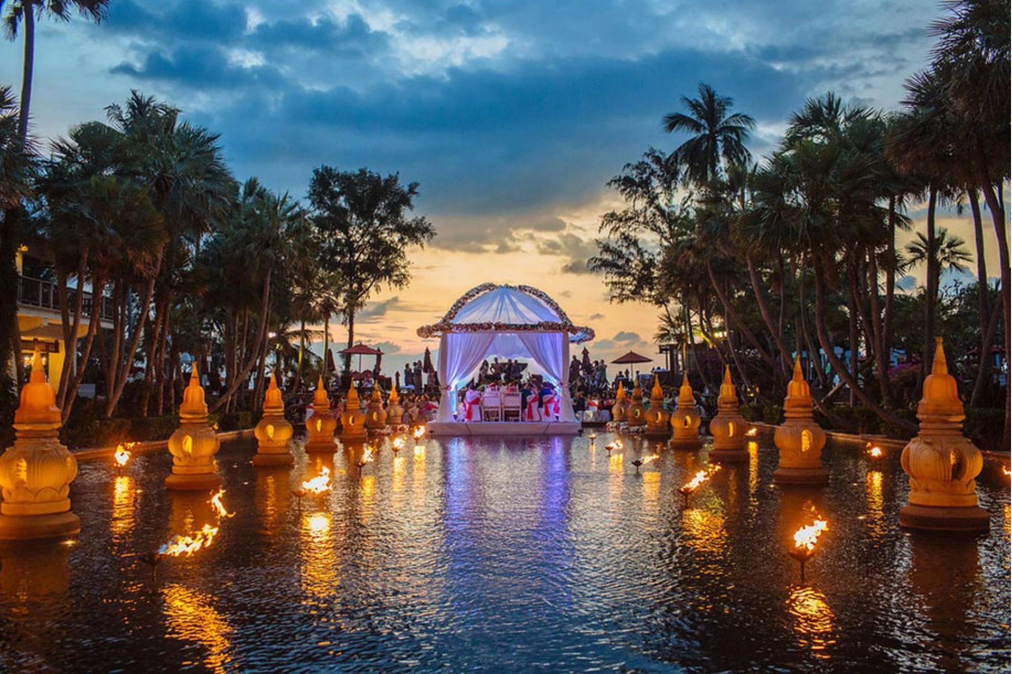 Floating mandaps are one of the most trending concepts of the season. Built on platforms placed over pools, lakes, or water bodies, these mandaps create a magical illusion. Surrounded by candles, lanterns, and fresh blooms, they turn the entire setup into a breathtaking scene. This design is ideal for luxury resorts, beaches, and destination wedding venues with large water features.