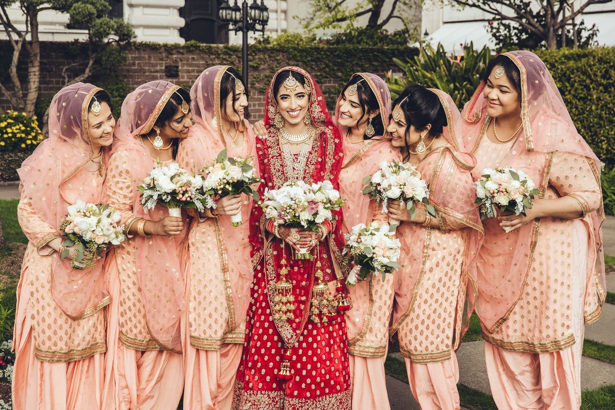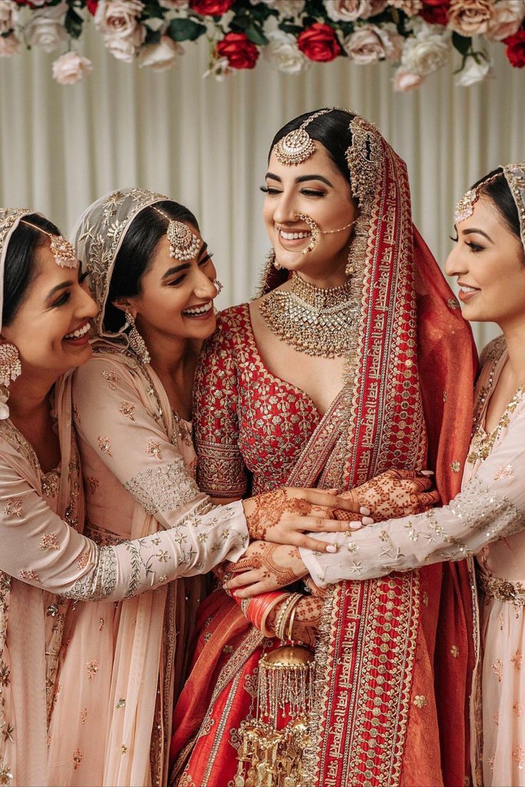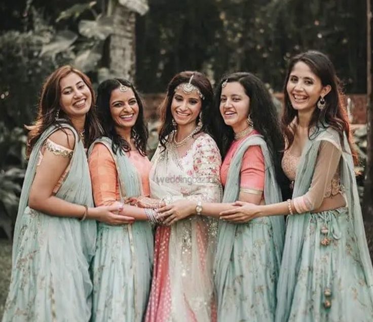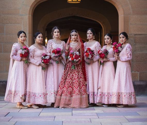 A trending combination for 2025–26 weddings, brides in traditional red paired with bridesmaids in pastel pink creates a visually captivating contrast. It adds depth to group pictures and strikes a perfect balance between modern and traditional aesthetics.