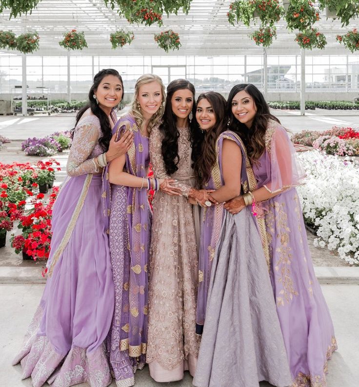 This palette is ideal for brides who love subtle shimmer with sophistication. Mauve outfits paired with rose-gold accents look incredibly chic. Brides may opt for mauve lehengas with rose-gold embellishments, while bridesmaids wear lighter mauve or soft rose-gold tones.