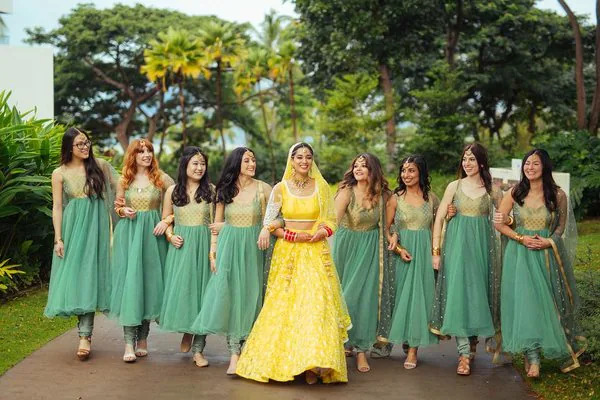 A bold and royal combination, emerald green matched with gold radiates grandeur. Brides can opt for gold lehengas or sarees, while bridesmaids complement the look with deep emerald outfits. The richness of green photographs beautifully in both day and night events, making it a favorite for sangeets and receptions.