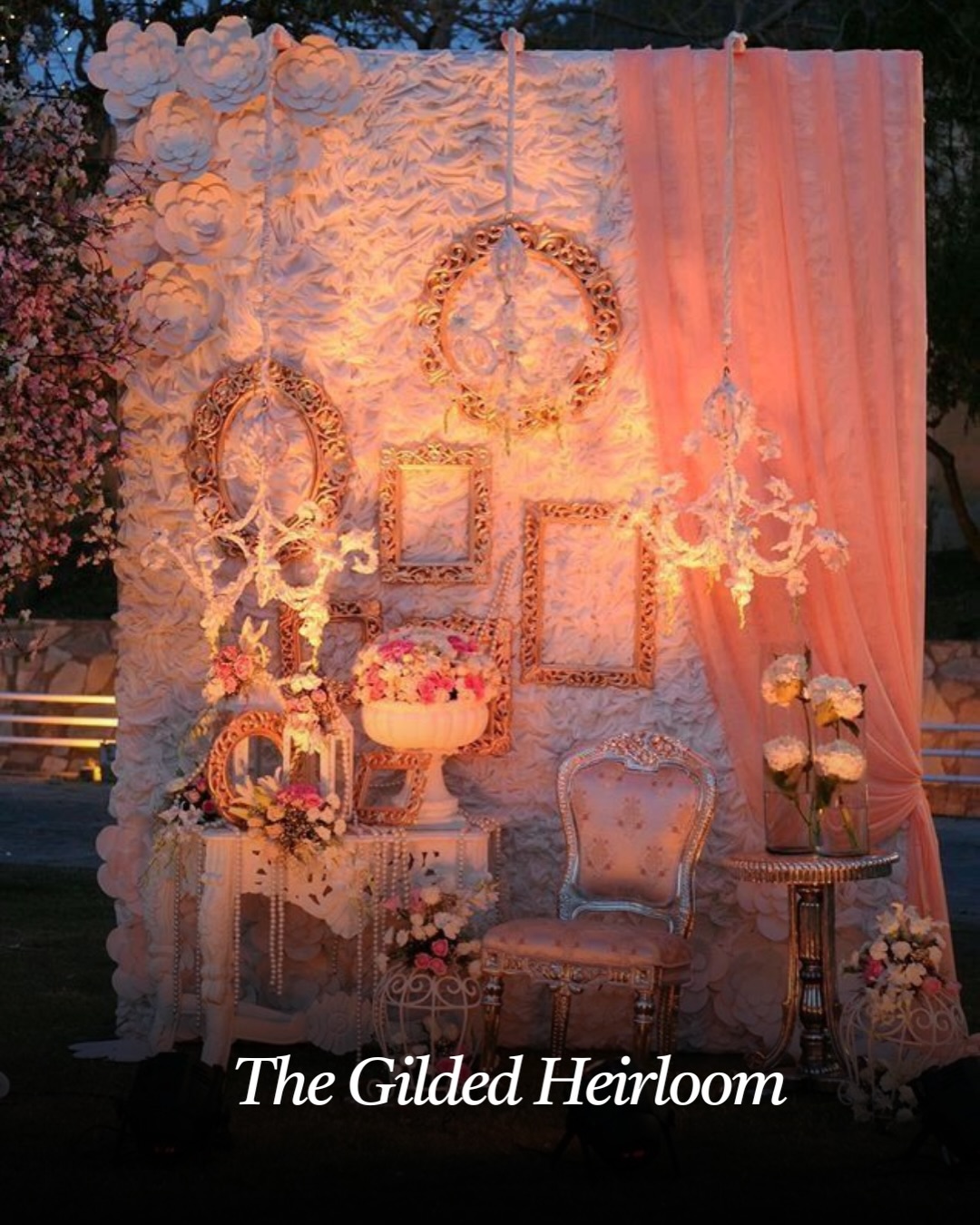 A gilded heirloom backdrop pairs beautifully with warm lighting and soft florals in shades of ivory, champagne, and blush. Guests can pose with vintage props such as lace fans, antique cameras, and classic hats to create photos that feel straight out of a royal portrait gallery.