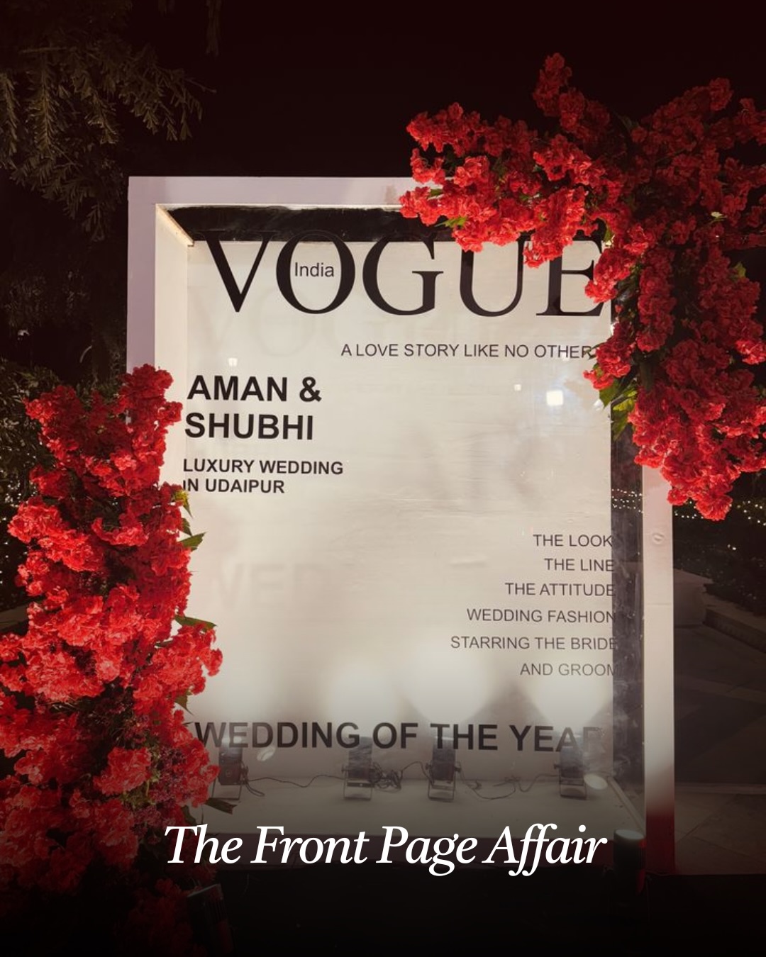 Design a large newspaper-style frame with your names, wedding date, and fun headlines such as “Love Story of the Year” or “A Perfect Match.” Guests can step inside the frame and strike playful poses.