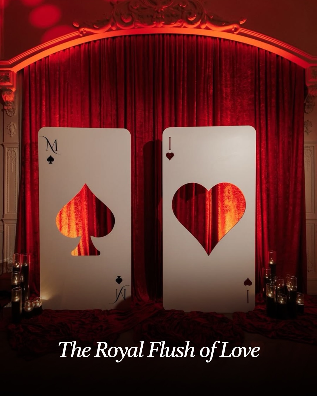 Inspired by the elegance and drama of a royal casino theme, “The Royal Flush of Love” photo booth features playing cards, velvet backdrops, and glamorous décor elements.
