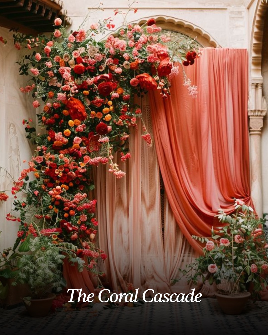 For couples who love vibrant décor, the Coral Cascade photo booth offers a refreshing burst of color. This setup features cascading florals in shades of coral, peach, and soft pink paired with lush greenery.