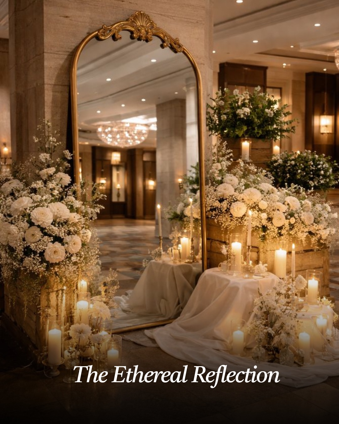 An ethereal reflection photo booth creates a magical and dreamy experience using mirrors, soft lighting, and delicate décor elements.