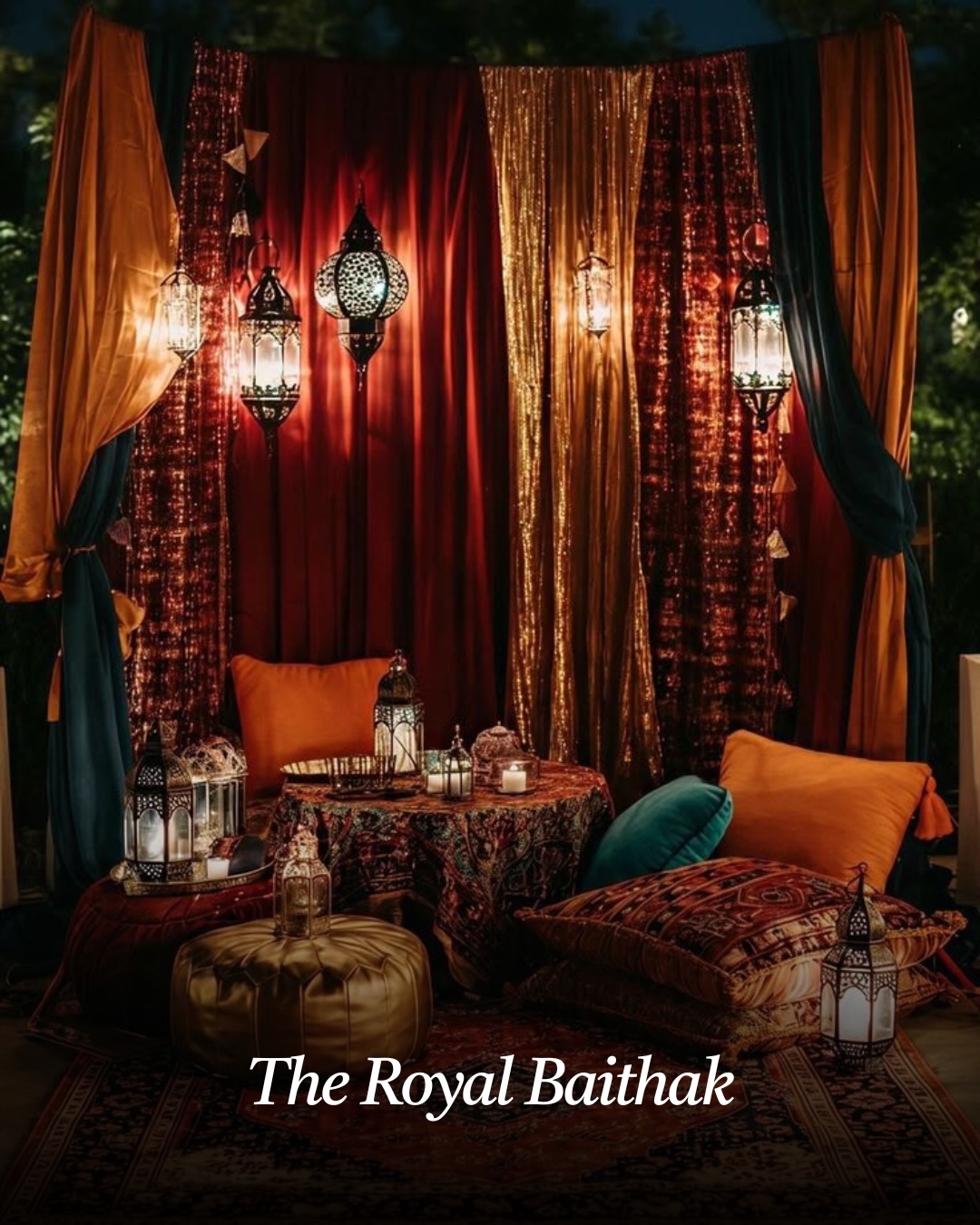 Inspired by traditional Indian seating arrangements, the Royal Baithak photo booth offers a cultural and elegant experience. The setup includes low seating, embroidered cushions, traditional rugs, and decorative lanterns.