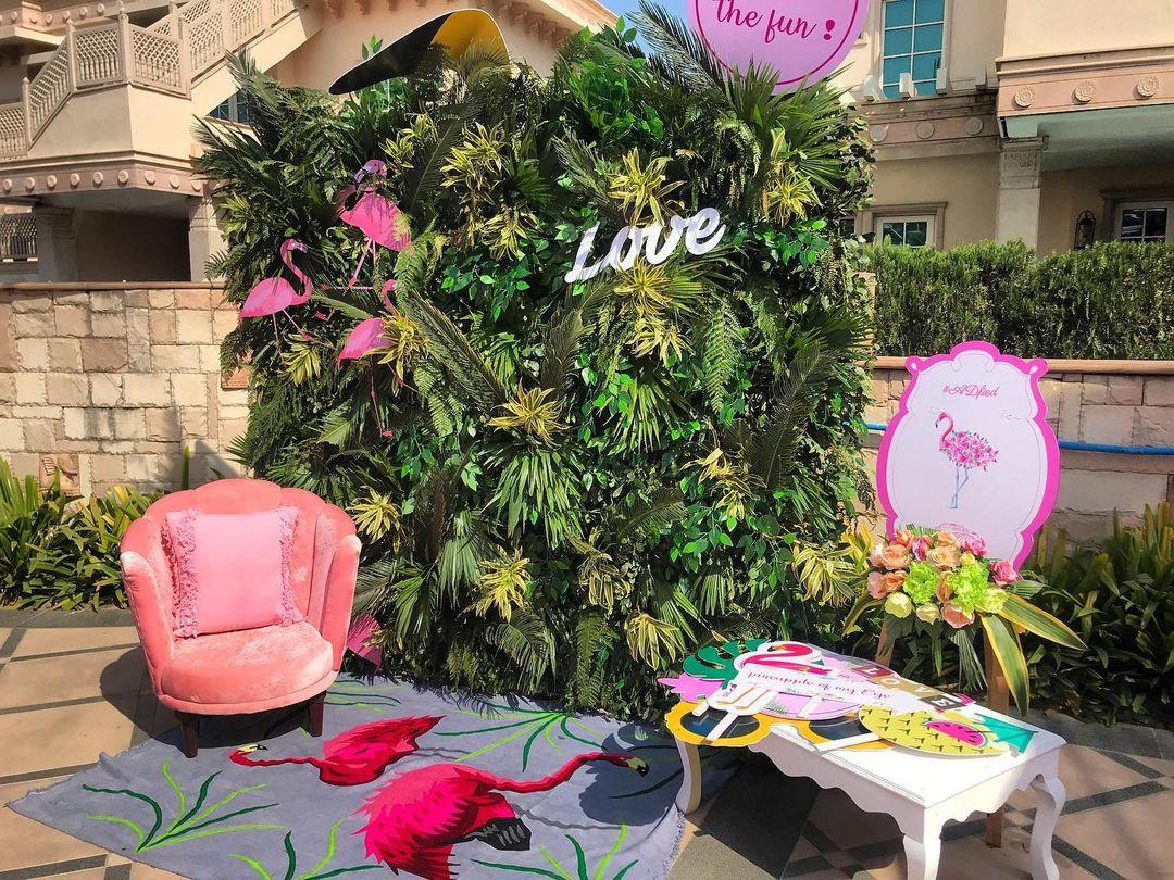 Velvet seating, candle arrangements, and subtle fairy lights can enhance the mood even further. Guests will love posing in front of this bold and glamorous setup.