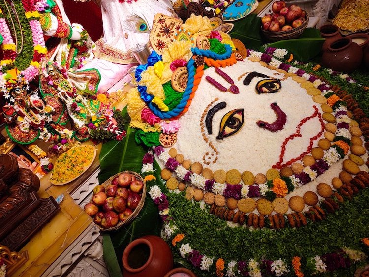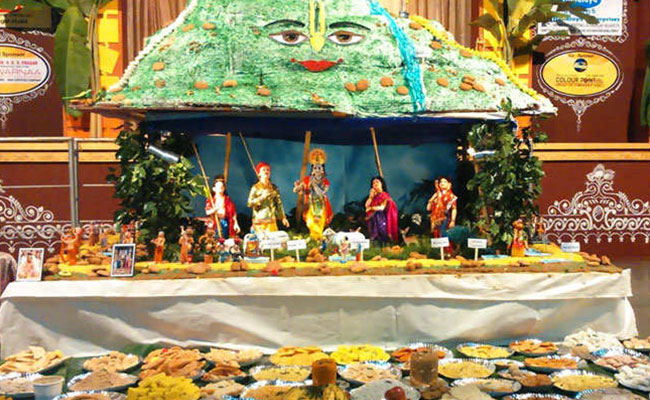 Temples prepare lavish food spreads with over 100 dishes, which are later distributed as prasad.