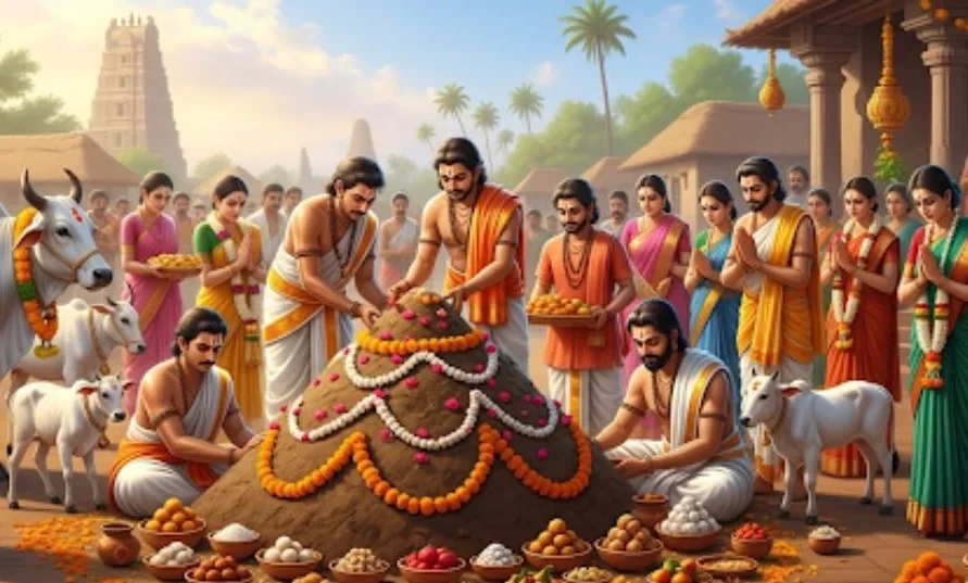 Traditionally, people make small mounds of cow dung to symbolize Govardhan Hill, decorating them with flowers, diyas, and rangoli.