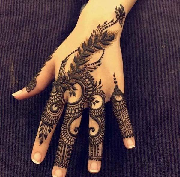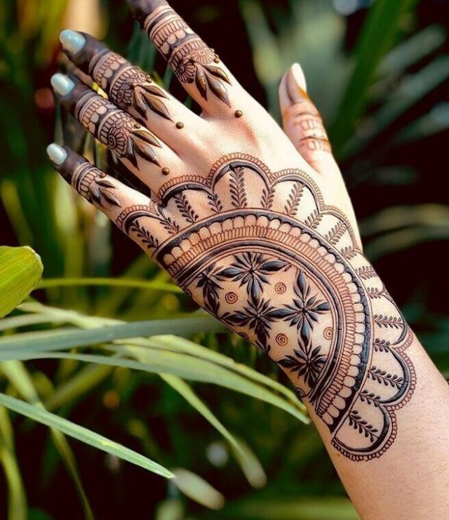 This henna design dazzles us with various bel designs that emerge from the side fingers, making it suitable for any occasion.