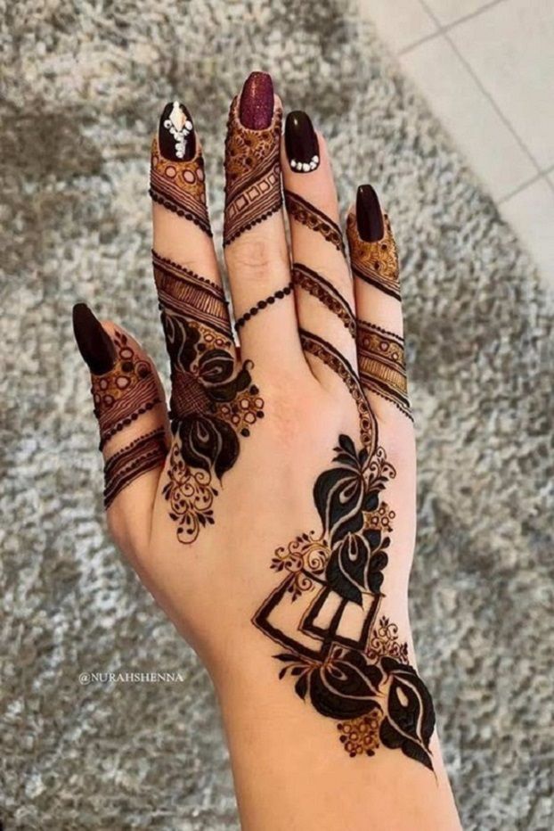 Classic and straightforward one-finger mehndi pattern, which looks excellent with a coat of red glossy nail polish to dress it up.