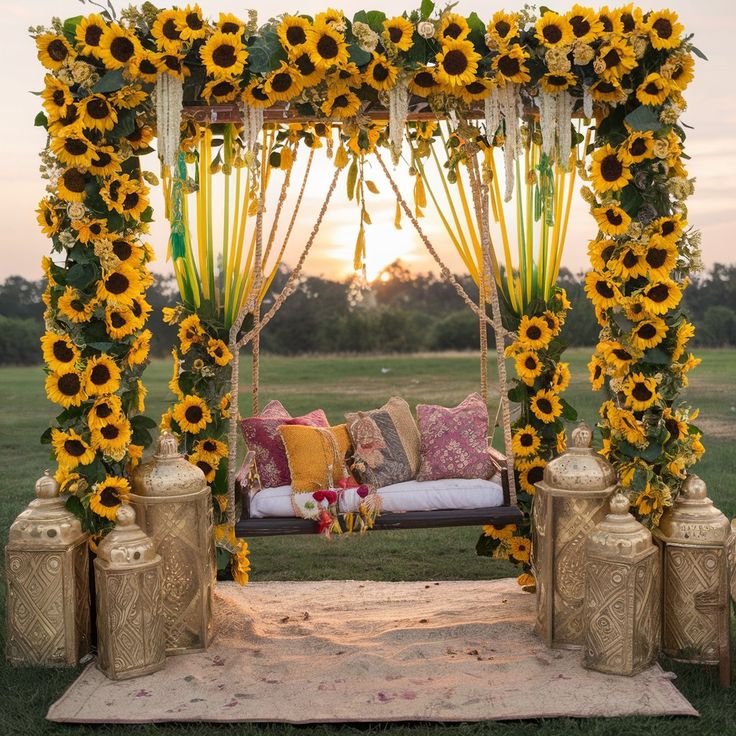 Transform your Haldi ceremony into a bright and cheerful affair with a sunflower theme. Sunflowers symbolize positivity, joy, and warmth, making them the perfect choice for this occasion. Deck the venue with vibrant yellow sunflower garlands, floral arches, and centerpieces. Pair the sunny hues with rustic wooden elements and white drapes to create a stunning contrast.