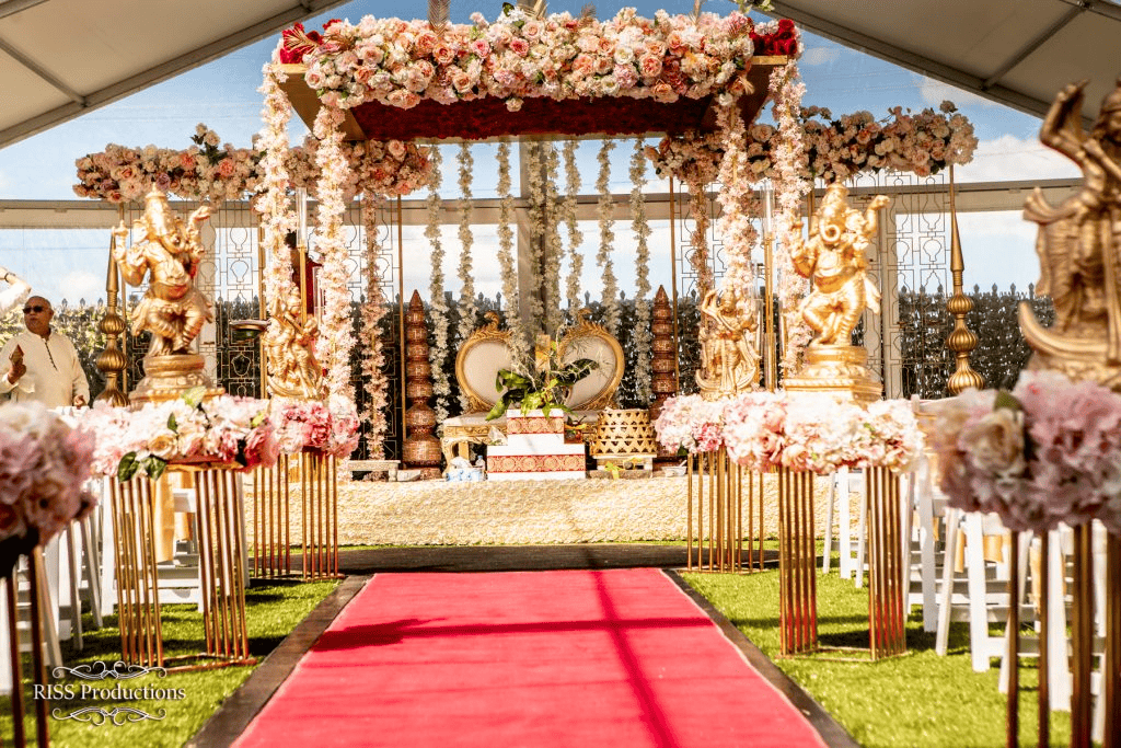 Oversized installations using pampas grass, orchids, baby’s breath, and native Indian flowers are stealing the spotlight. Expect bold, unconventional floral structures, from spiral arches to ceiling-hung floral drapes. Add LED lighting or neon signs to give the arrangement a dramatic flair.