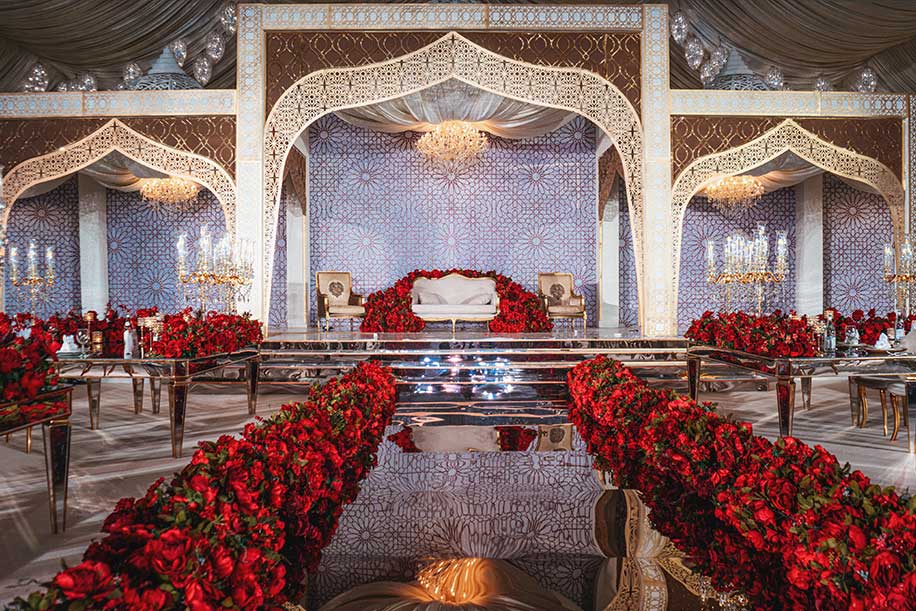 Inspired by Rajasthan’s Sheesh Mahal, mirror work is being woven into decor panels, stage backdrops, and even table runners. Paired with soft lighting, this adds a luxurious and ethereal glow to evening events.