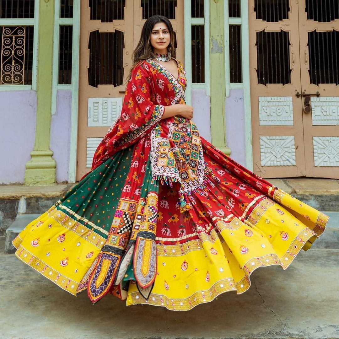 Young girls and women participate in the dance by donning adorned ghagra cholis. These cholis have elaborate beadwork, embroidery, mirror work, shell work, and other decorations to make it look appealing for the festival. Whereas the ghagra is a long, colourful skirt that is paired with cholis. Additionally, these ghagras have mirrors and embroidery on them. They typically have a dupatta and are available in contrasting colours. With this traditional attire, girls prefer to wear traditional embellishments such as churi - kadas, big danglings or jhumkas, and maang-tikas for complete traditional look. Some women also like to wear kamarbandh and payal to complete the look.
