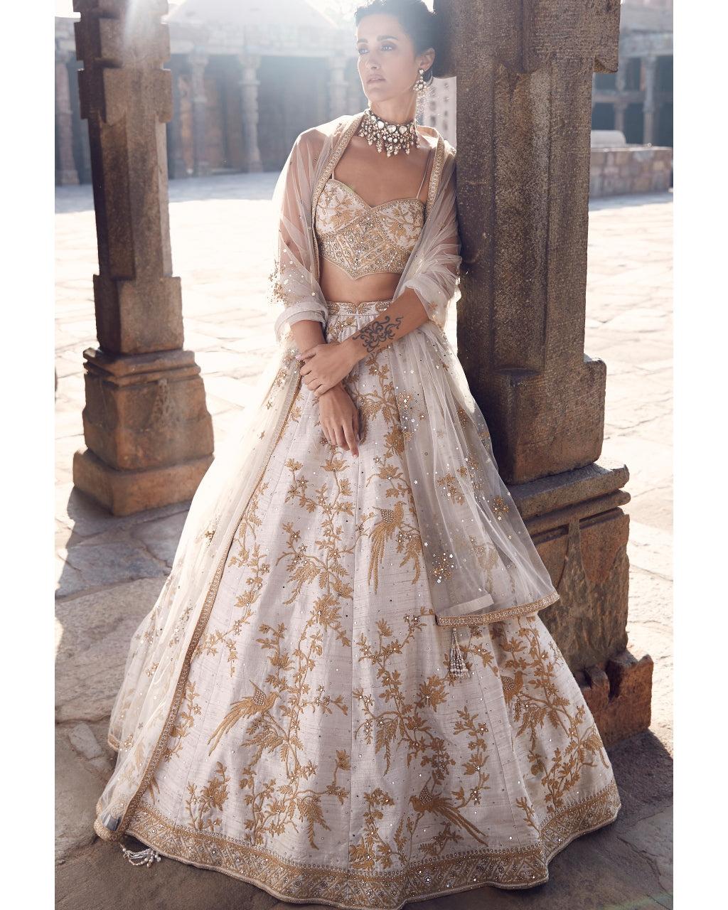 For brides who want something different from conventional blouses, embroidered corset blouses are a showstopper. Featuring intricate zari, zardozi, resham, or hand embroidery, these blouses act as statement pieces on their own. They pair beautifully with heavily embroidered lehengas or minimalist sarees, allowing the blouse to take center stage in the bridal look.