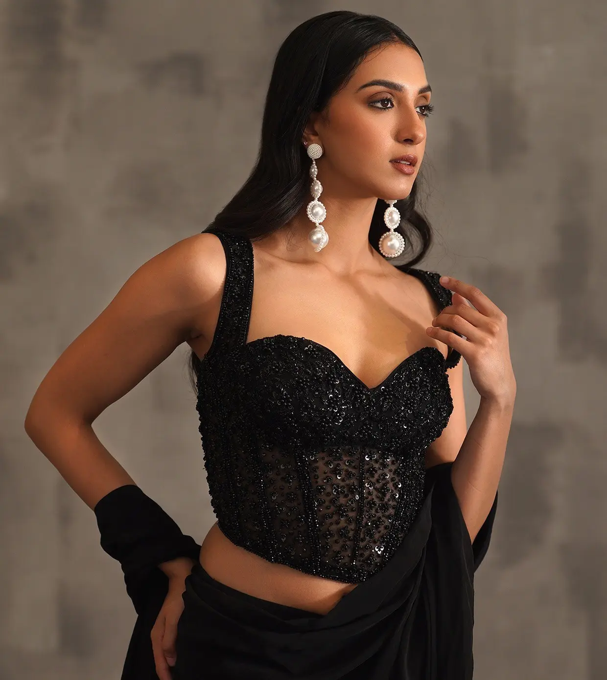 Styling plays a crucial role in making a corset blouse look effortless and elegant. Pair heavy corset blouses with simpler drapes to maintain balance. Statement jewellery like chokers or layered necklaces complement sweetheart and strapless designs beautifully. For off-shoulder or sheer styles, opt for sleek hairstyles such as low buns or soft waves to keep the focus on the blouse.