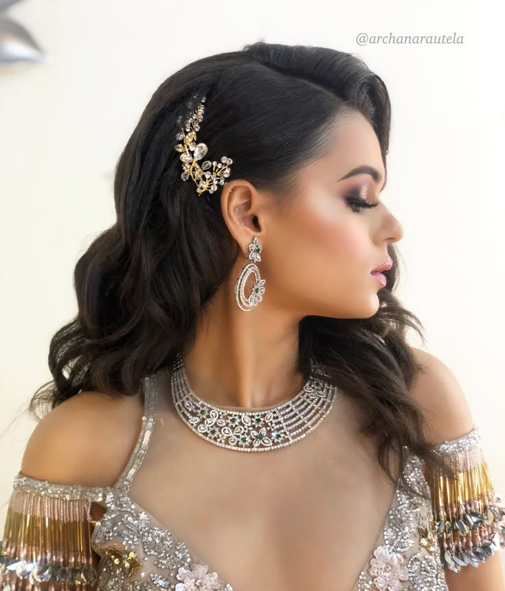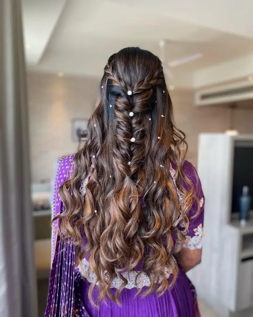 Half-up hairstyles have become a bride tribe favourite because they offer the best of both worlds, structure and freedom. This style allows the face to remain framed while letting the length of the hair flow naturally. Bridesmaids often enhance this look with soft braids, twisted sections, or minimal hair accessories like crystal pins. It works beautifully for sangeet nights and cocktail parties where movement and comfort are key.