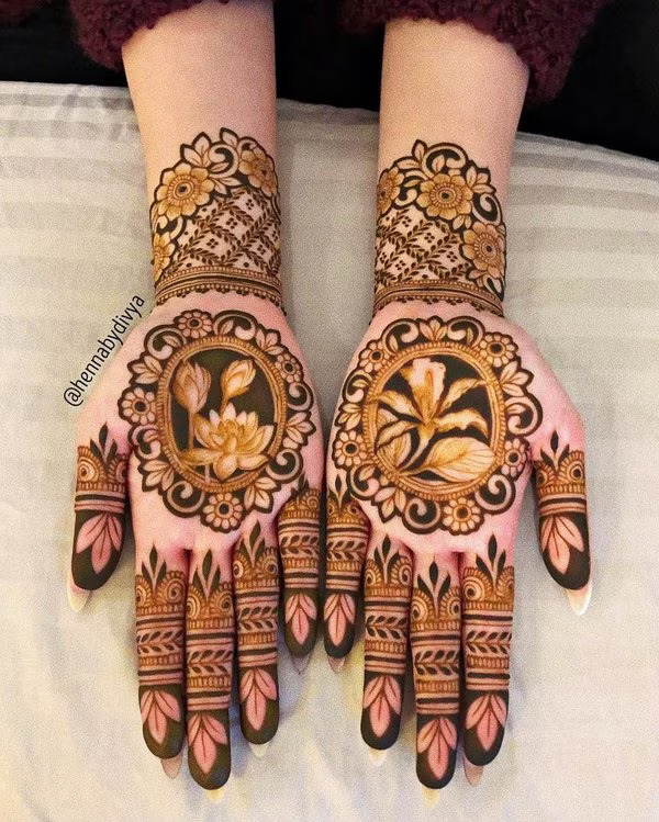 If you love detailed mehndi designs then floral rose patches all over the palm will delight you and your squad.