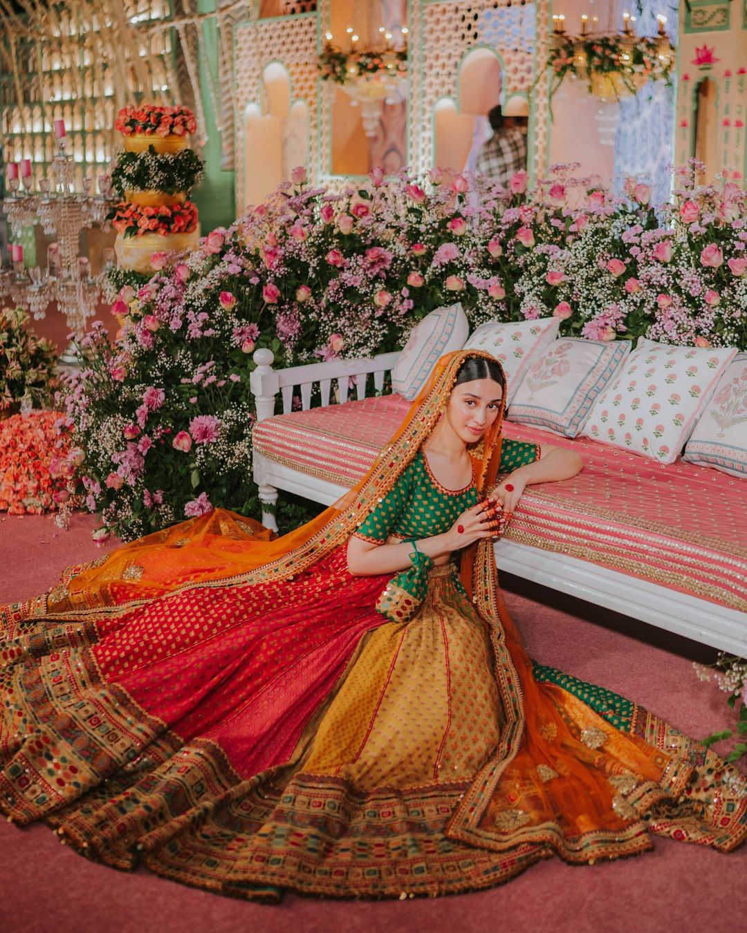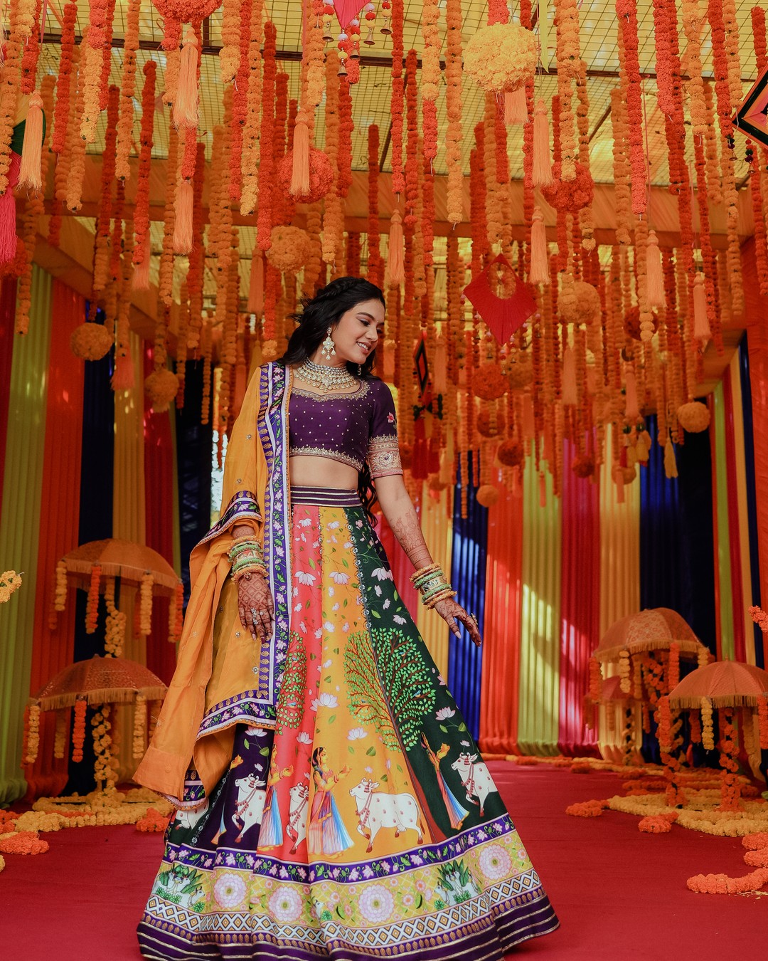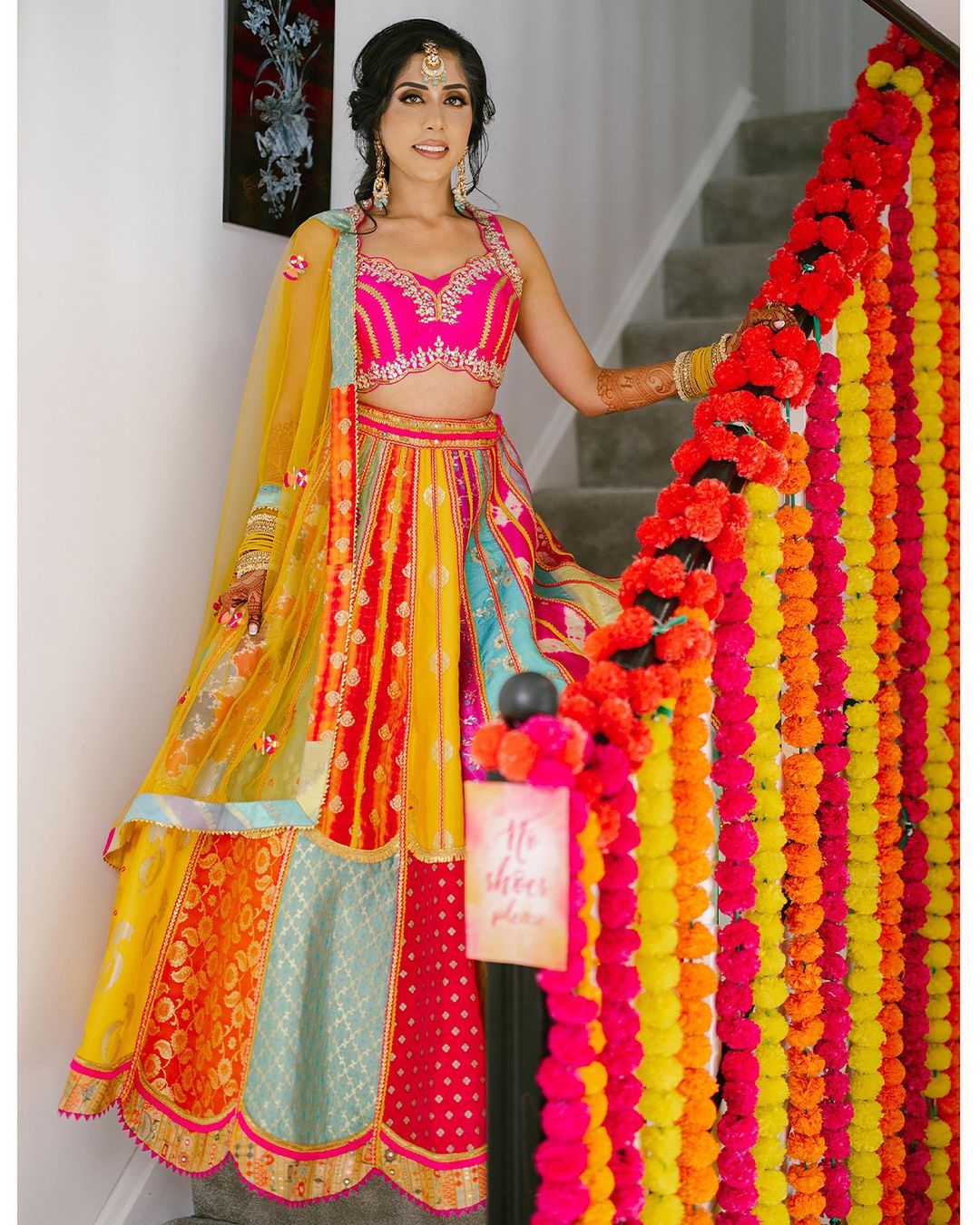 We absolutely adore the vibrant Mehendi lehenga worn by this adorable bride. The lehenga is adorned with a beautiful array of colors, creating a visually stunning and delightful ensemble.