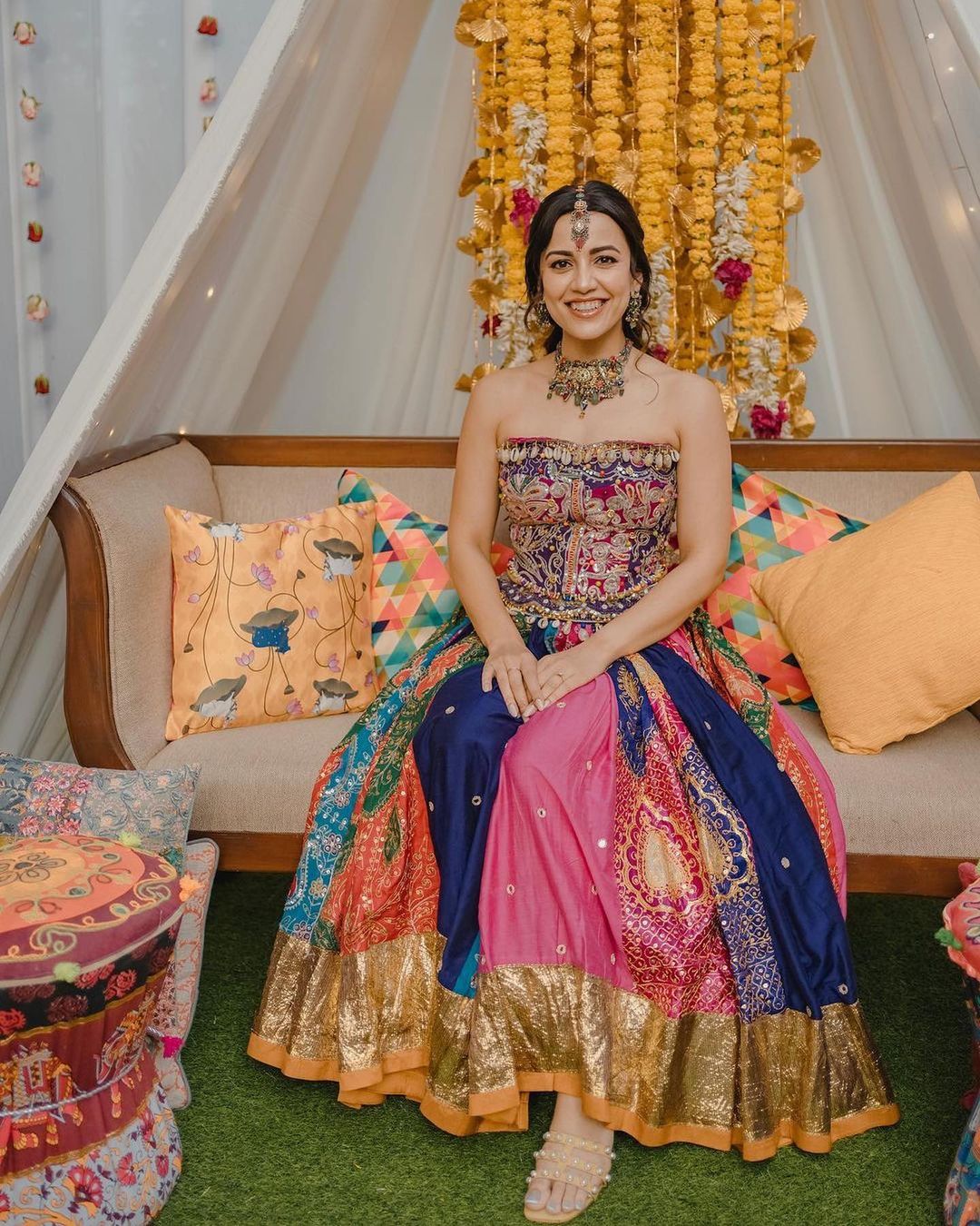 The beautiful bride's Mehendi outfit is truly stunning. It showcases a simple lehenga paired with an adorned blouse and a contrasting dupatta, creating a unique and charming look. The multicoloured ensemble is both eye-catching and elegant, adding a touch of vibrancy to the bride's overall appearance. With its exquisite detailing and delicate embellishments, this outfit is truly one-of-a-kind.