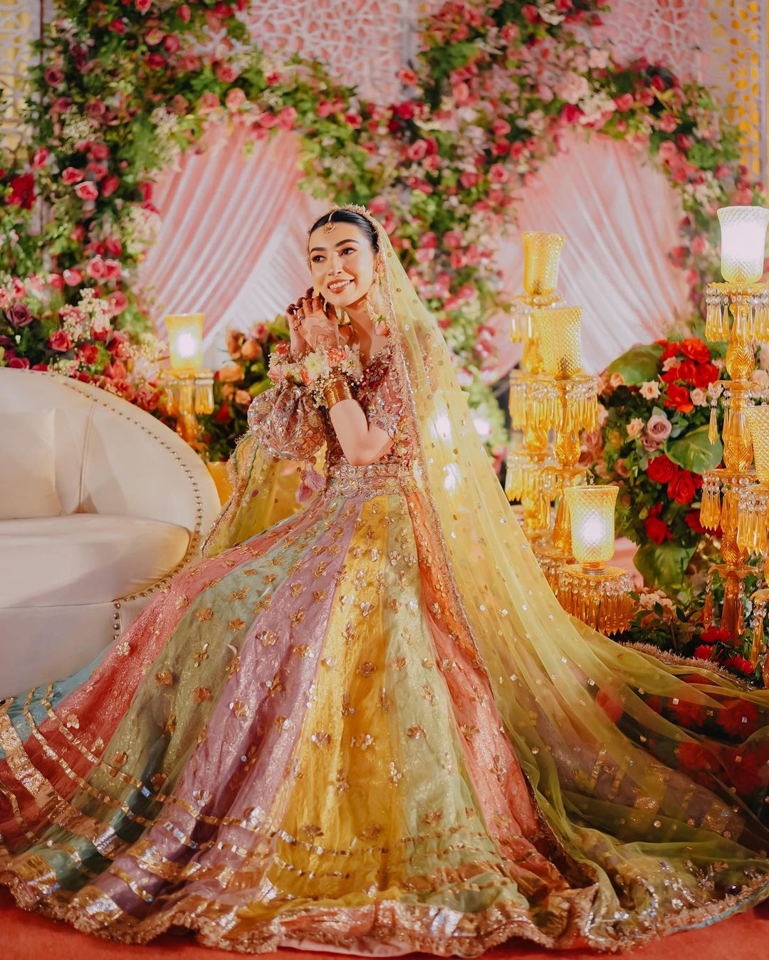 We are completely captivated by the enchanting pastel tones and multicolored lehenga worn by this beautiful bride. The combination of colors is incredibly refreshing and evokes a dreamlike quality.