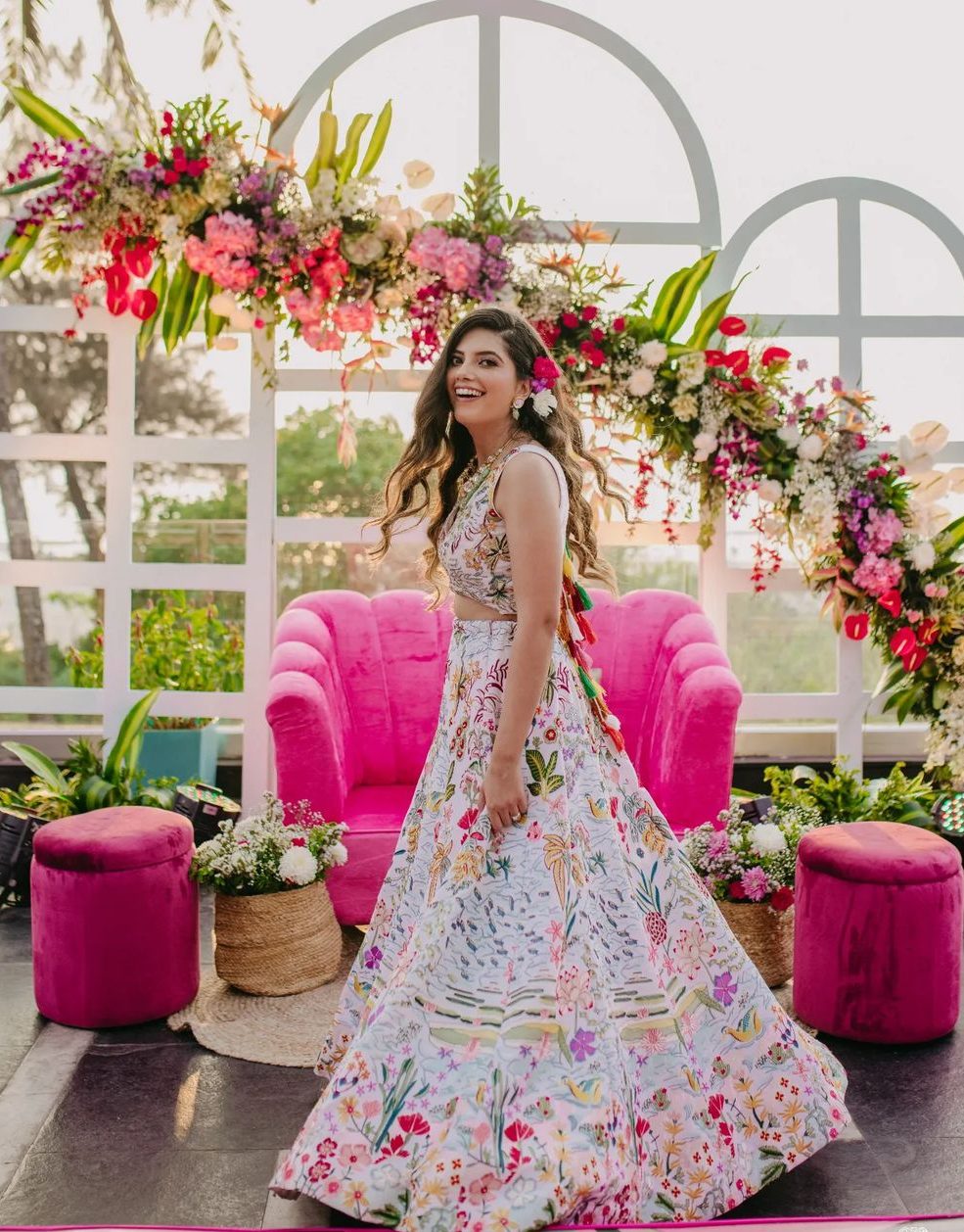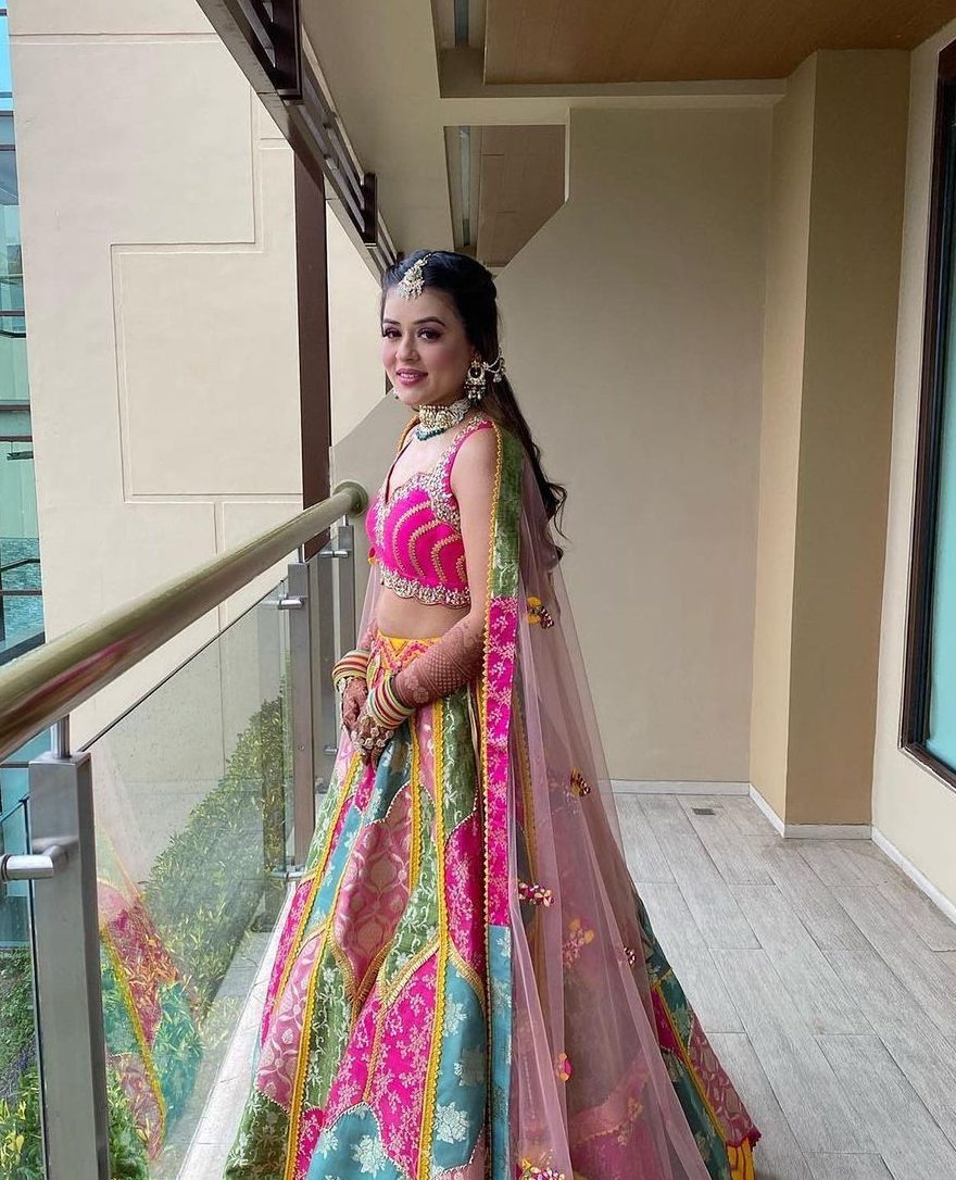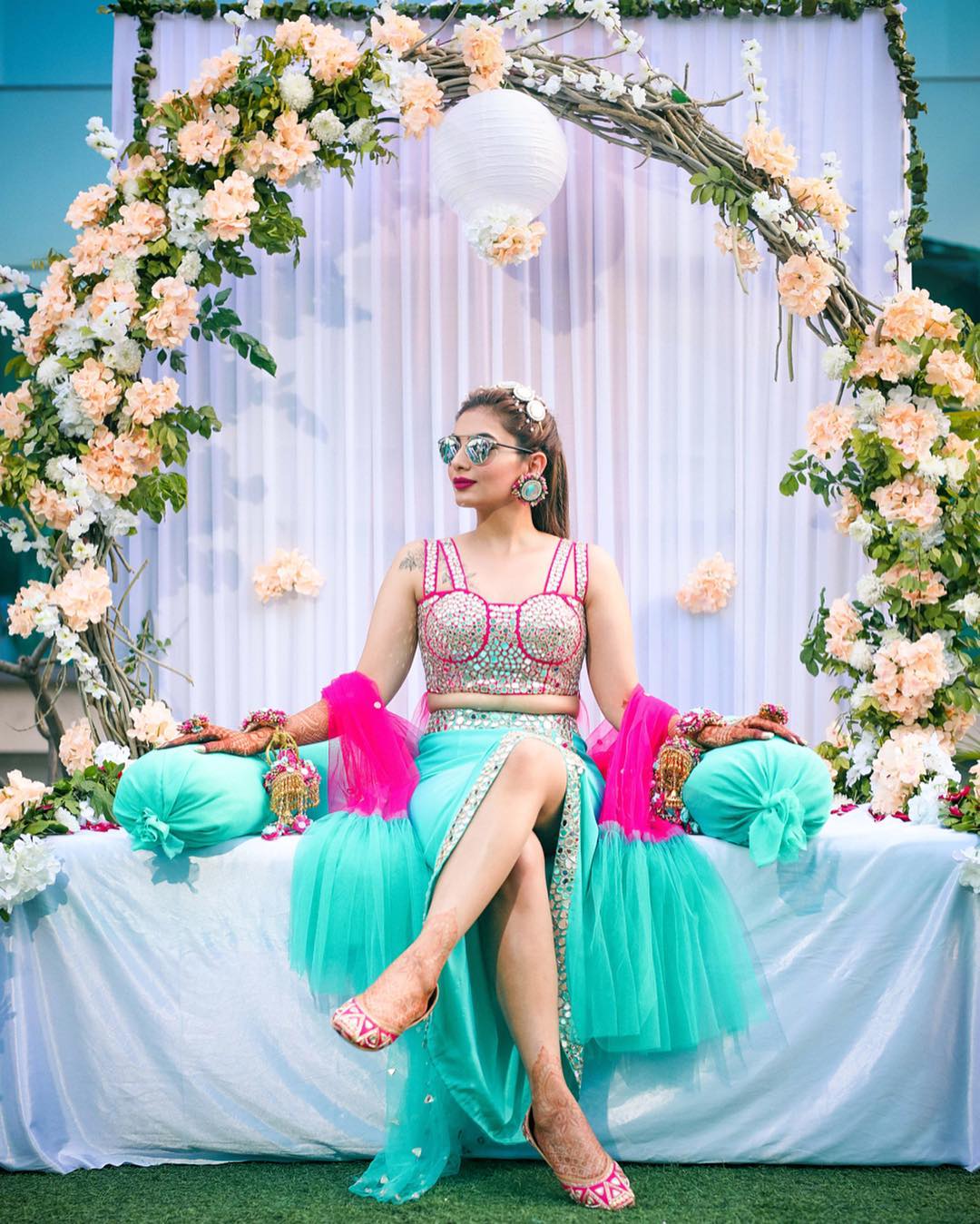 If you are looking to wear a vibrant lehenga for your Mehendi ceremony while maintaining a light and bright look, you can draw inspiration from the adorable pictures of this bride.