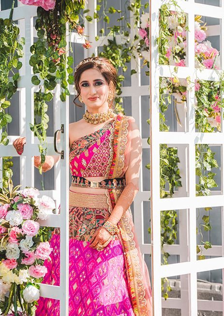 How easy and elegant does this stunning bride look in her vibrant multicolored lehenga, perfectly complemented by a contemporary one-shoulder blouse?