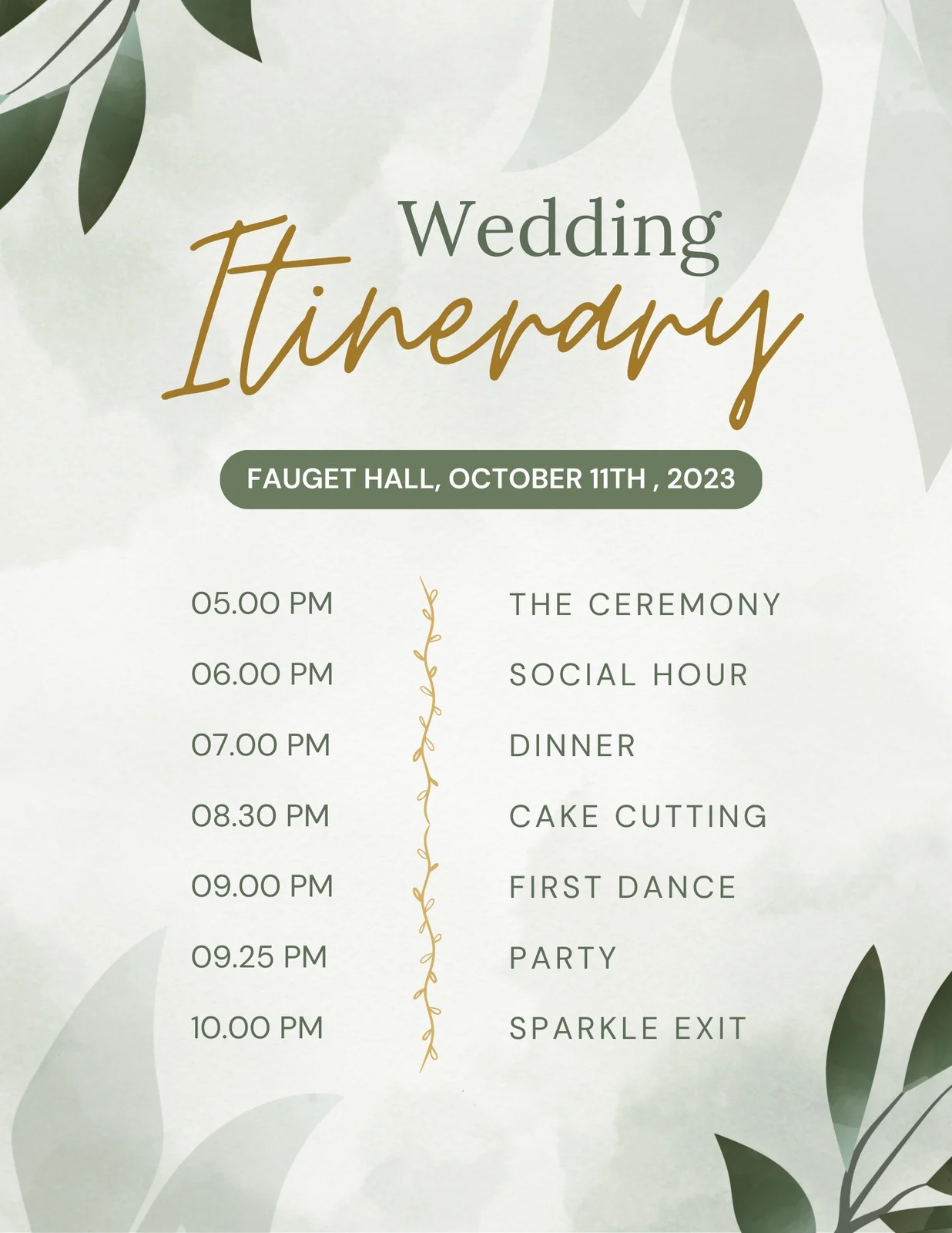 - Outline major events, including the ceremony, reception, and special performances.